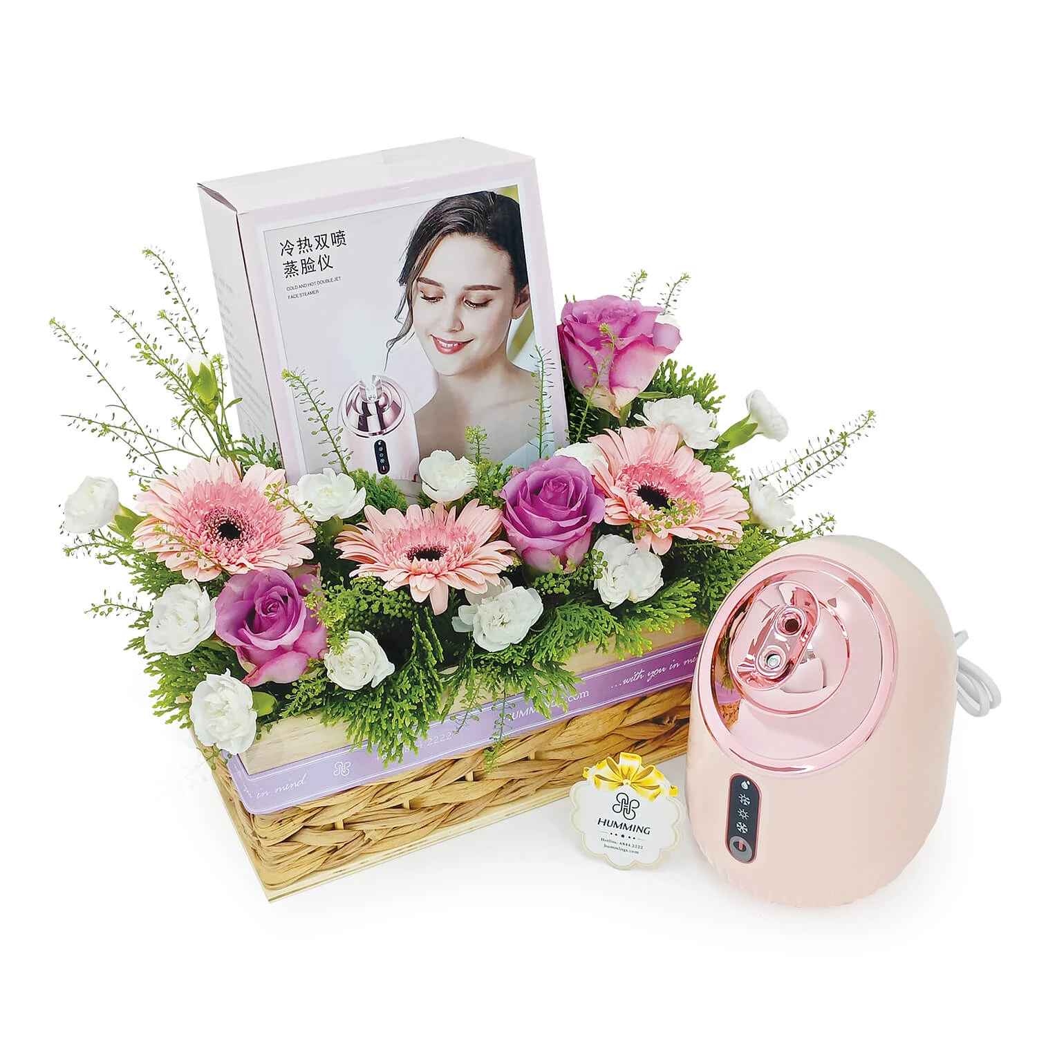 • Complete with fresh flower arrangement consists of 2 Red Orchid, 2 Champagne Carnation, 1 Pink Carnation, 3 Pink Rose, 3 Shocking Pink Rose, 1 Pink Cymbidium, 2 Champagne Carnation Spray, Eucalyptus, and Johore Fern,