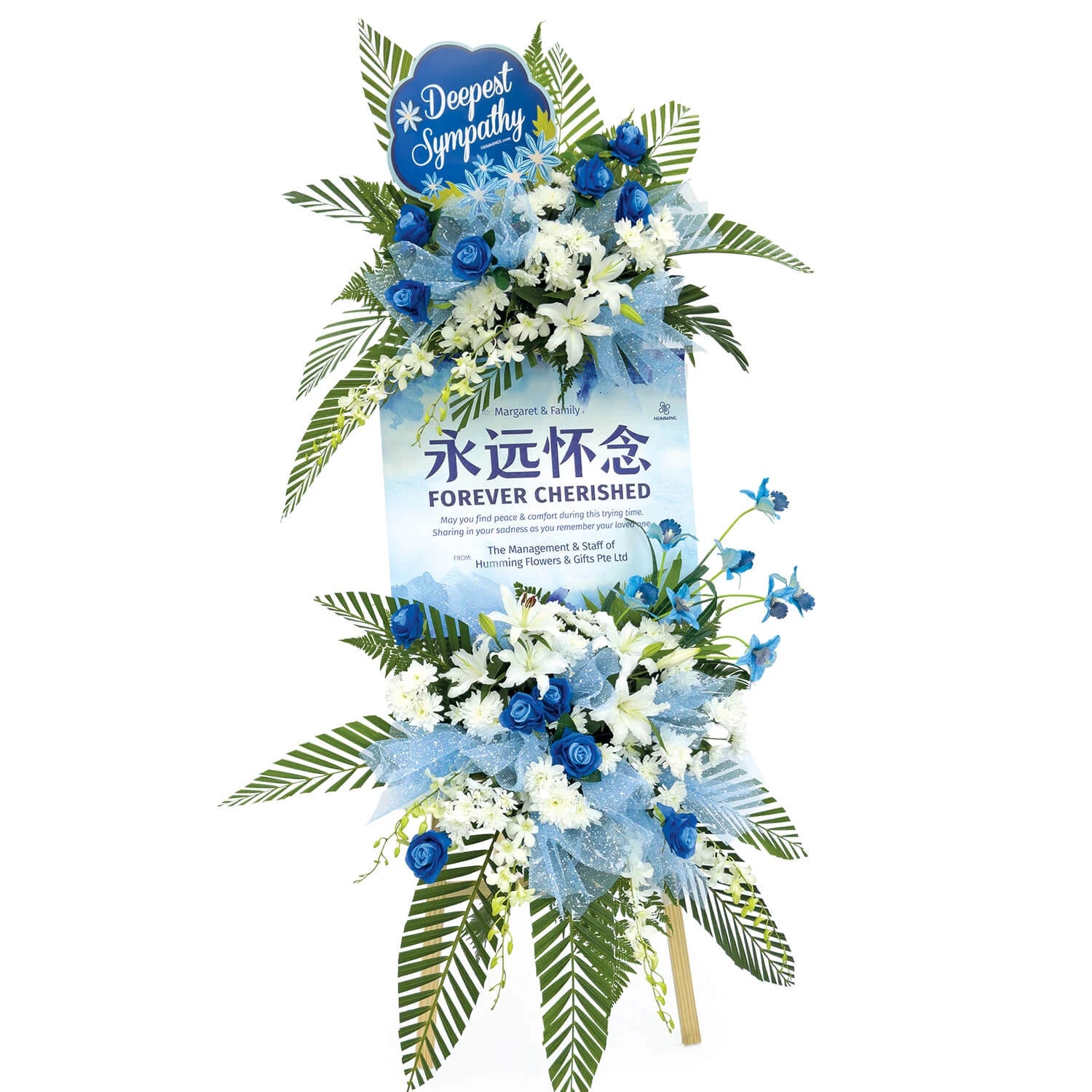 - White Lily, White Fuji, White Orchid, Artificial Blue Rose, Artificial Blue Cattleya, accompanied with Johore Fern and Palm Leaf.