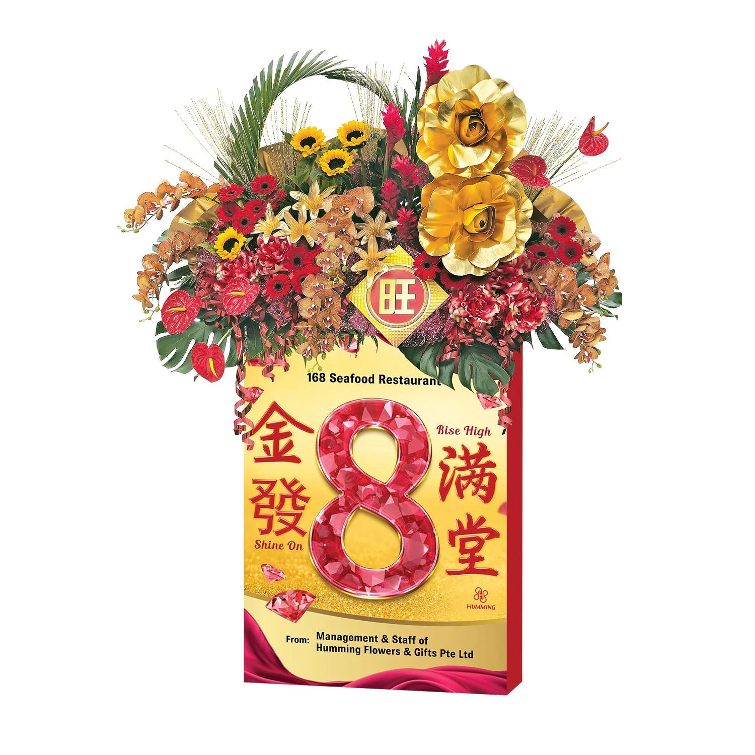 Impressive blooms, elaborate adornments and an auspicious ‘8’. Convey your wishes of abundant wealth and triumphant prosperity.