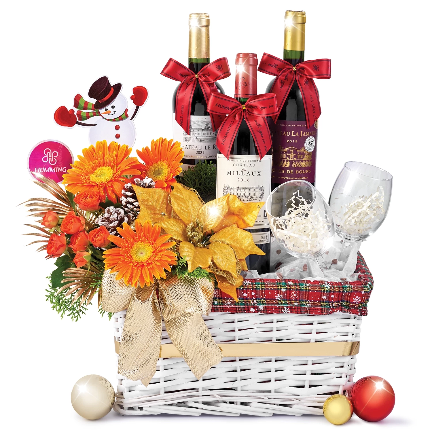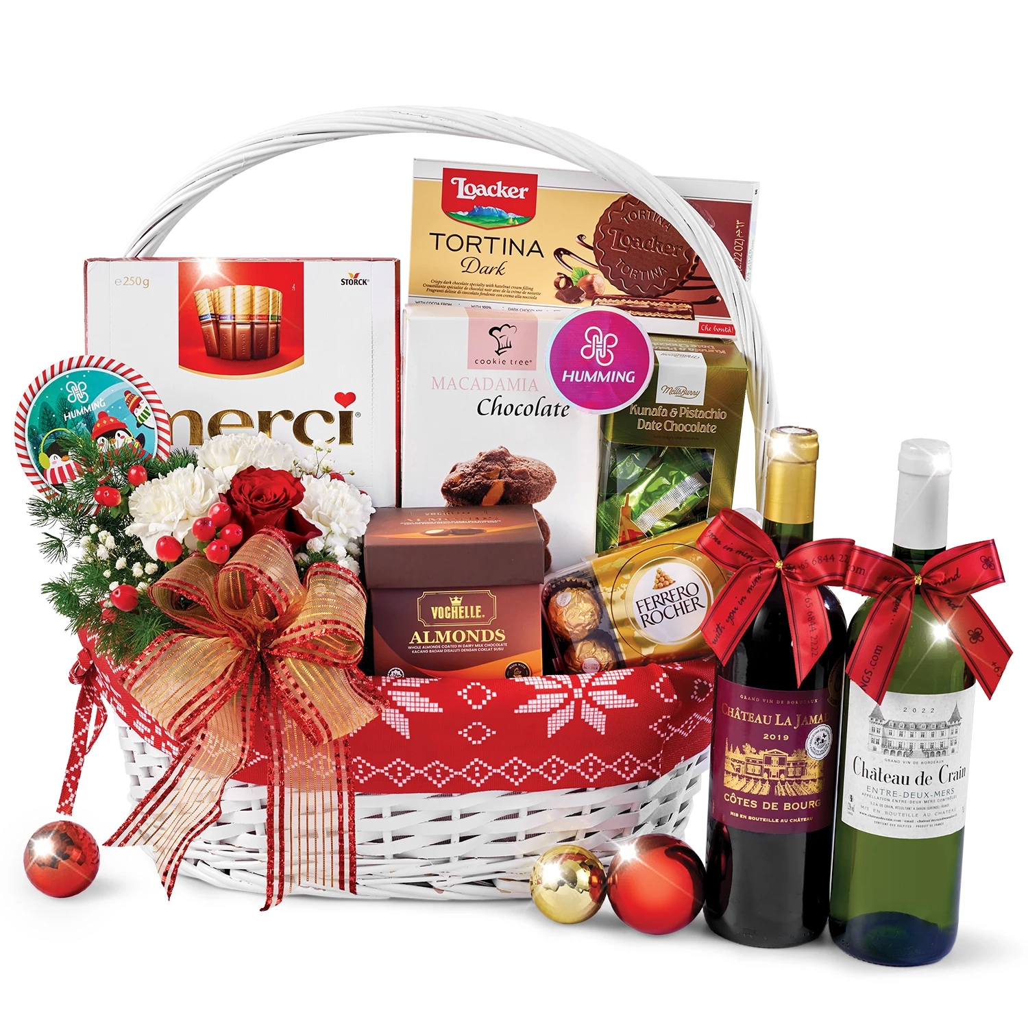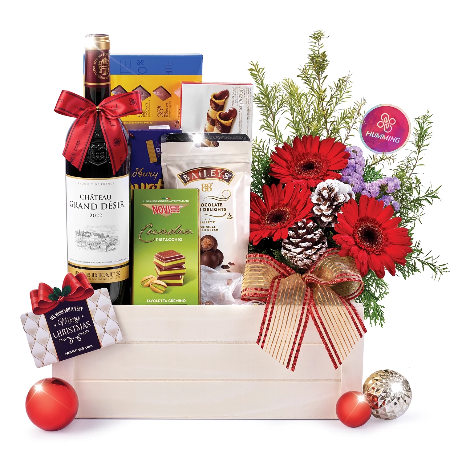 Send your warmest holiday wishes with this elegant and timeless gift set — a perfect pairing of fine wine, indulgent chocolates, and festive blooms that express love, appreciation, and celebration.