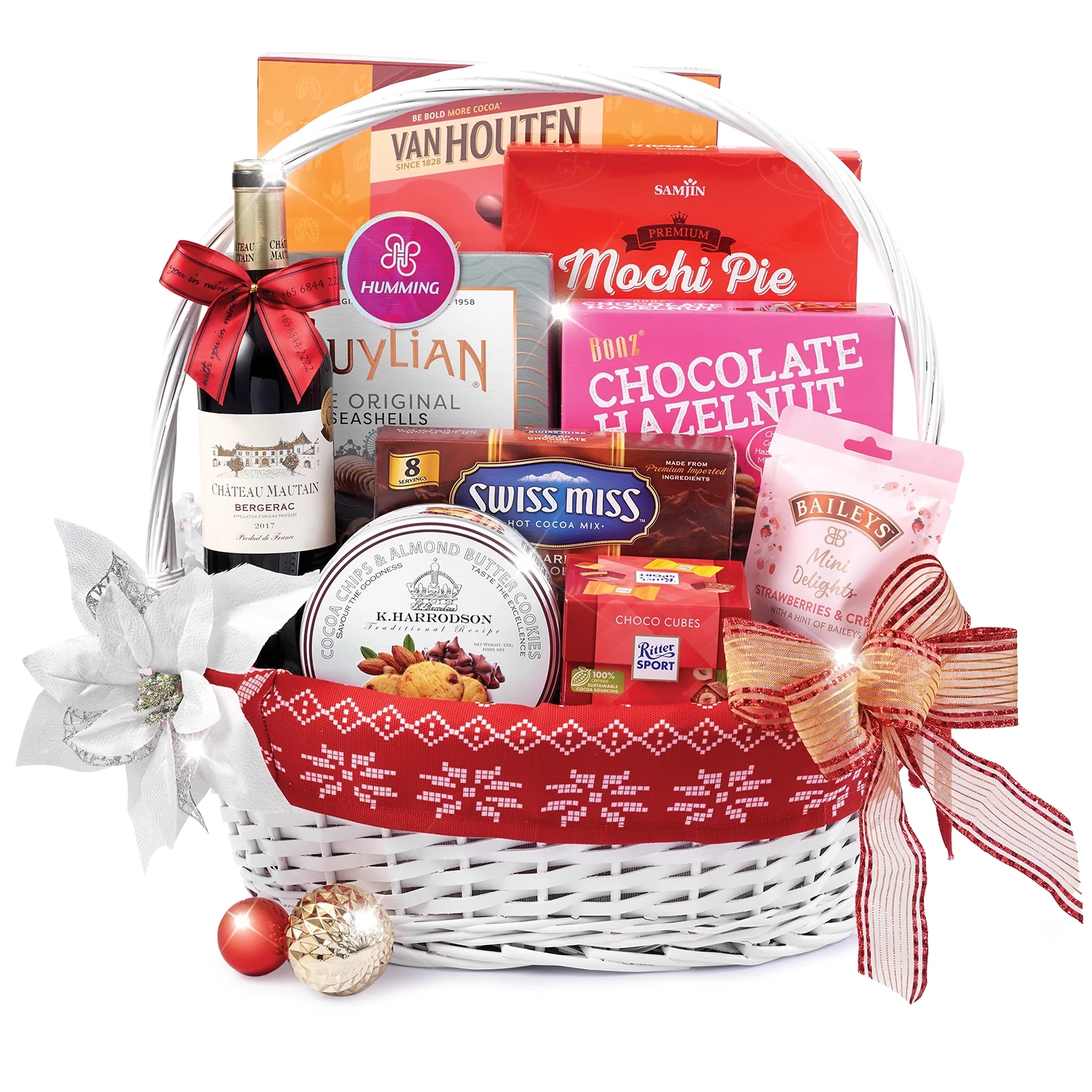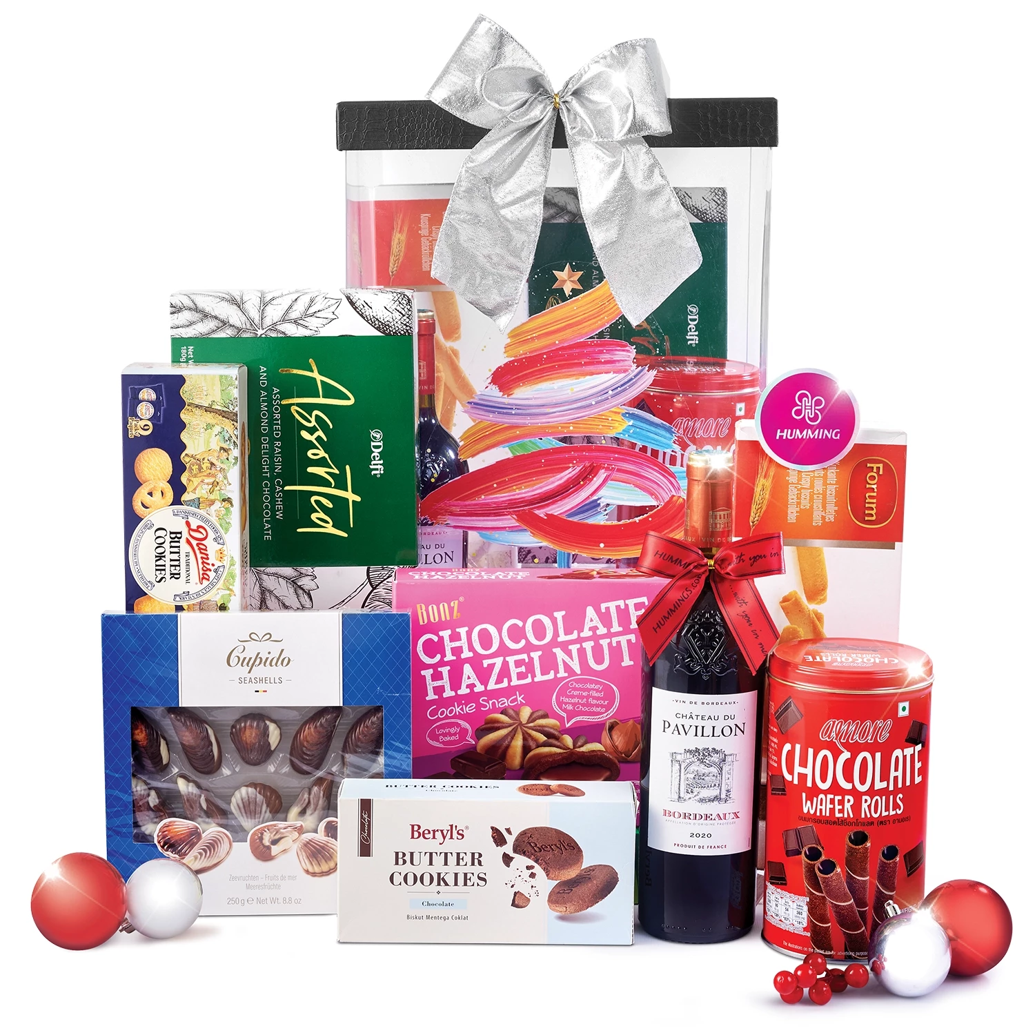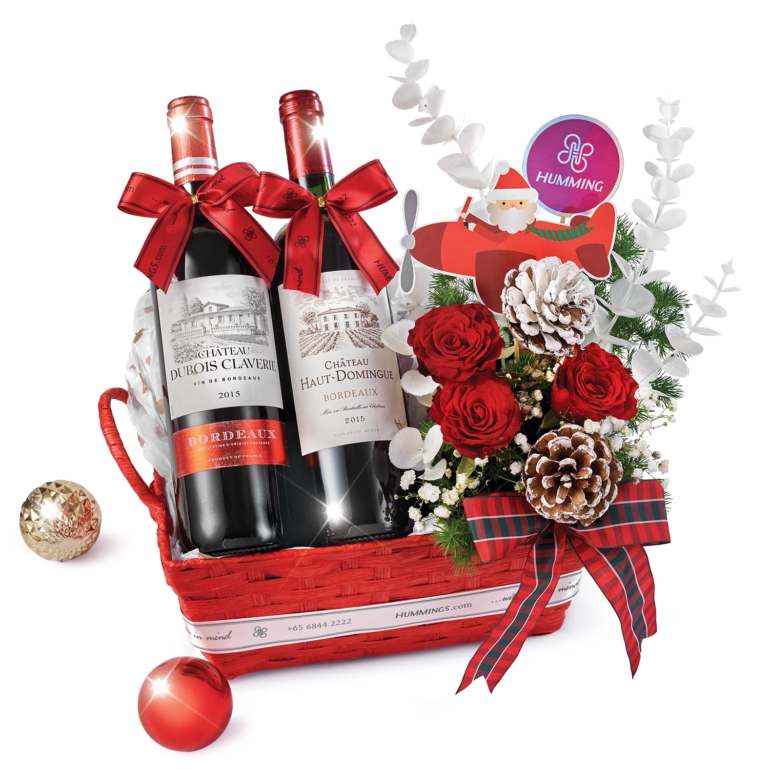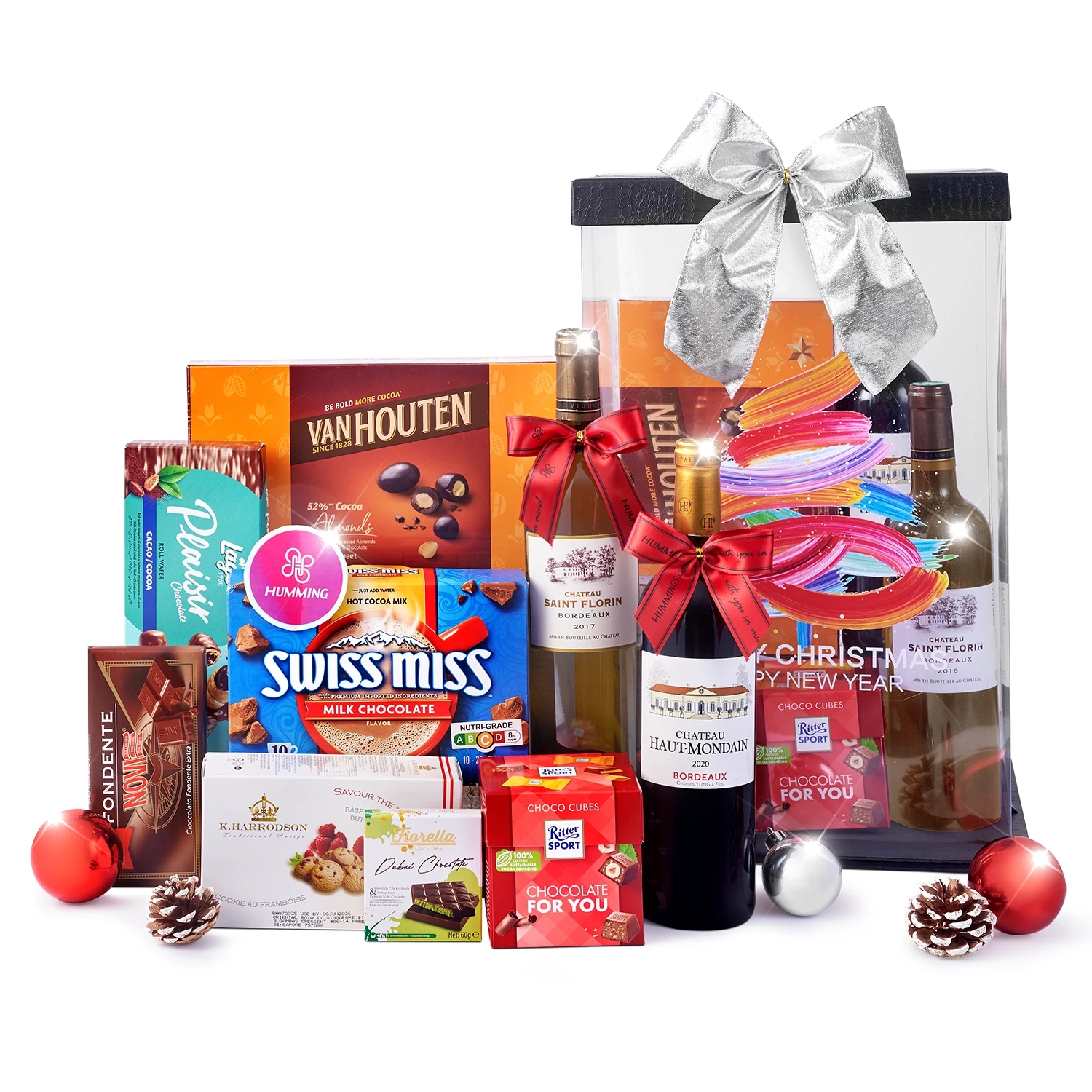 Send your warmest holiday wishes with this elegant and timeless gift set — a perfect pairing of fine wine, indulgent chocolates, and festive blooms that express love, appreciation, and celebration.