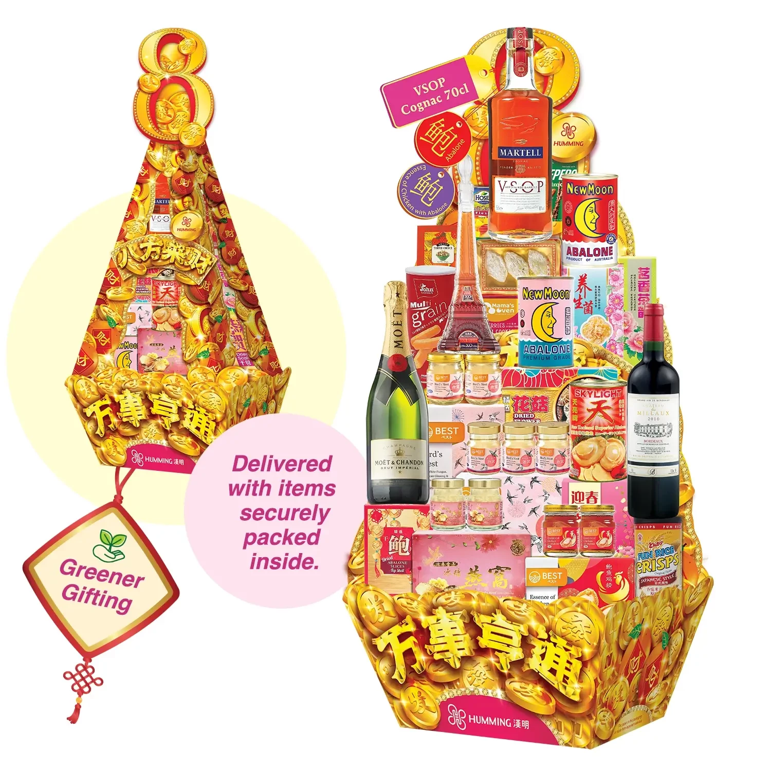 Celebrate success and prestige with the Prosperity Distinction hamper. Featuring Eiffel Tower Cordon XO Cognac Extra, Bonheur Brandy XO, Lavigne XO Sweet Wine, double New Moon Superior Abalone, premium Bird’s Nest selections, Essence of Chicken with Abalone, roasted pistachios, gourmet cookies, ginseng candy, dried delicacies, fine teas, and nourishing festive treats, this luxurious hamper is the ultimate expression of distinction and prosperity for the Lunar New Year.
